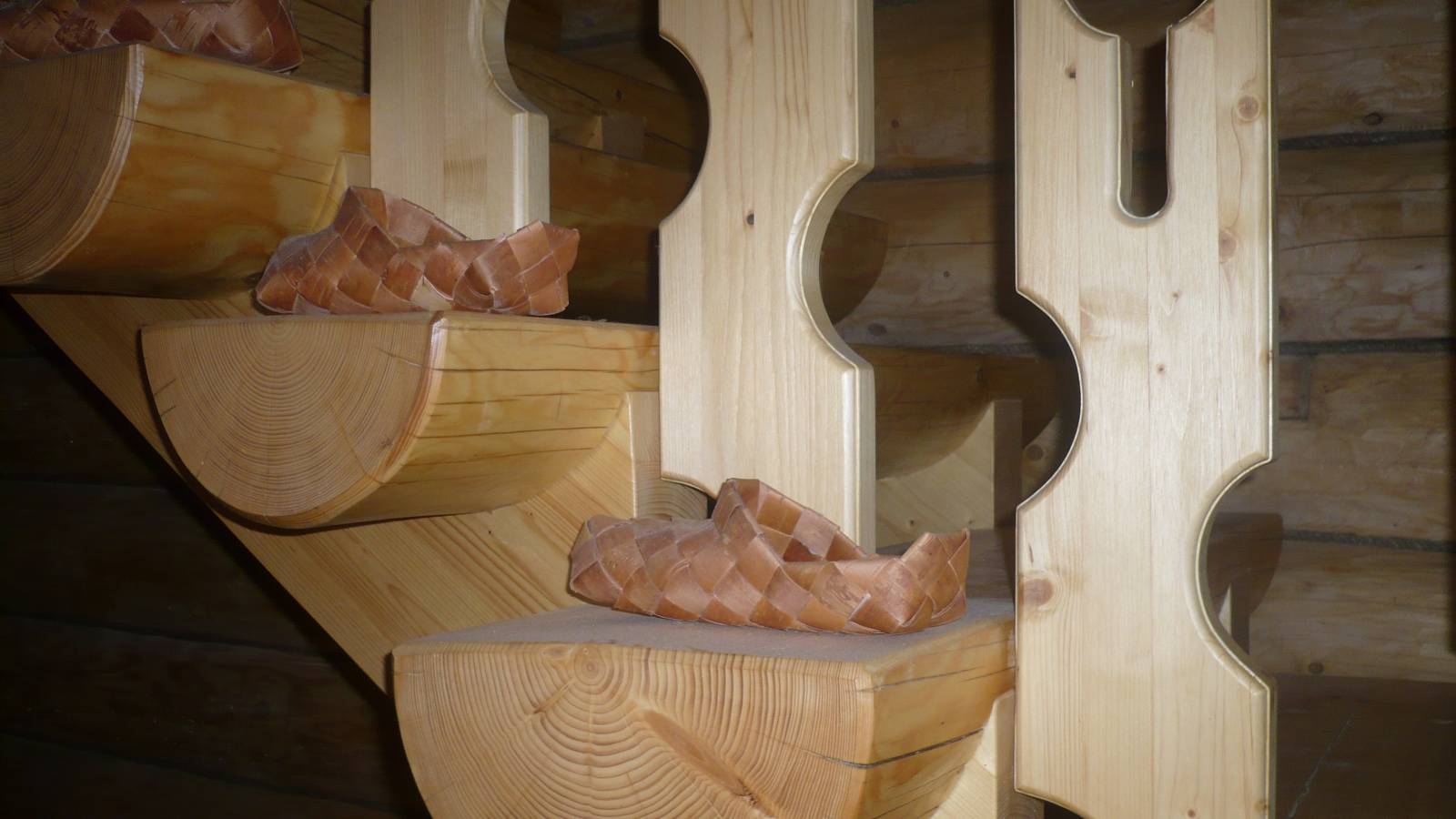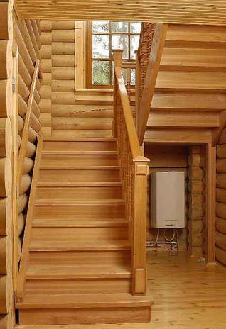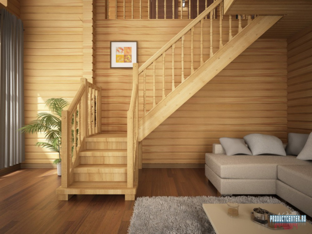 В зависимости от желаемого интерьера дома из бруса подбирают и вид деревянной лестницы для изготовления. Бывают лестницы с прямым маршем и лестничной площадкой или без оной, бывают также винтовые и криволинейные с прямыми ступенями. При выборе вида и расположения лестницы стоит ориентироваться и на то, чтобы она имела свободный проход. Если же сразу за ней начинается дверь, то должна оставаться хотя бы небольшая площадка, шириной не меньше ширины двери, а лучше и несколько больше. При планировке, предусматривающей непосредственное соприкосновение лестницы со стеной, сохранности конструкции будет способствовать выбор для размещения любой стены, кроме северной. Это будет способствовать тому, чтобы лестница не подвергалась вредоносным воздействиям влаги и ветра. Пограничные зоны дома, в которых тепло встречается с холодом, меньше всего подходят для установки лестницы, как и места, в которых предполагается расположение греющихся приборов. Эти же правила относятся и к деревянным лестницам для бань из бруса, в которых надо также учитывать расположение печки.
